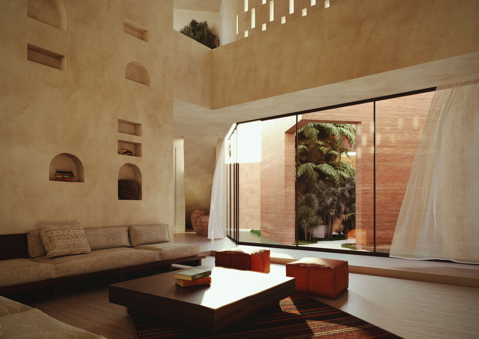 Along these paths, light penetrates only selectively, while the wind roams freely through its depths. Movement in this city means a transition from warmth to coolness and from noise to silence. This architecture comes from the harsh nature of this environment. Cracked earth became walls, and cracks became paths of life. Windy corridors, windows protected from direct sunlight, a cozy, cool courtyard and large, blank walls - all reflect the wisdom here. The heart of the house is the courtyard. A secret, closed garden under the open sky, where water and flora are the faces of tranquility. It cools both stone and air. Sunlight here is never direct; it is always secondary, filtered and calm. It penetrates through the cracks and gently touches both the outer and inner walls. Here it is an invited guest. The secret garden and other green spaces of the courtyard in this dusty landscape seem like an incredible discovery, where the heavy structure, the water, the flowering lemon tree or date palm, the cat lying in the shade and the old man curled up in a chair are in harmony. This architecture does not shout; it is rather a melody that can be heard if you listen carefully. It is like a prayer that is not spoken out loud, but still has power. These houses tell us how respect for tradition can become a modern way of thinking. How place and time can merge to create a space that, like a person, is strong on the outside and gentle on the inside.